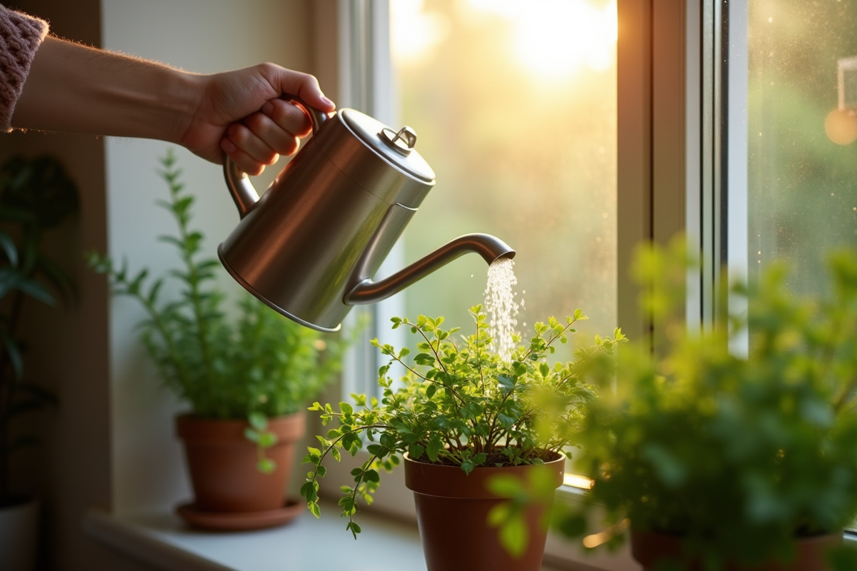 Pour limiter la consommation, rien ne vaut l’eau de pluie récupérée si vous en avez la possibilité. Moins calcaire que l’eau du robinet, elle est idéale pour les plantes d’intérieur et les fines herbes. Si la météo est avare, laissez reposer l’eau du robinet avant usage, cela fera l’affaire.