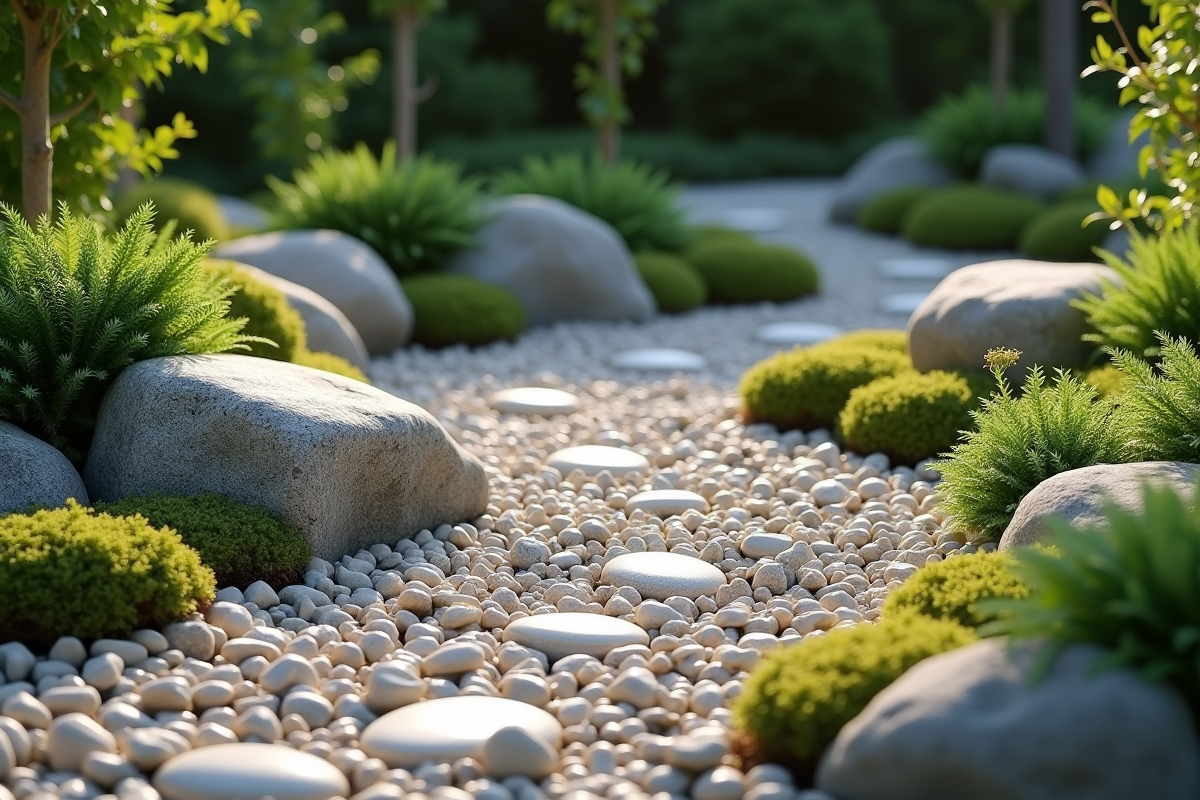 Les pierres ne se limitent pas à la structure. Utilisez des graviers ou des galets pour combler les interstices et ajouter une touche décorative. Les éclats de marbre ou les galets polis peuvent apporter de la couleur et de la texture à votre rocaille.